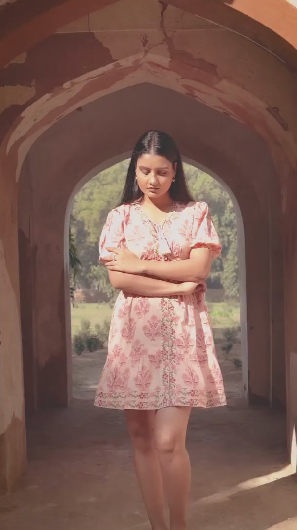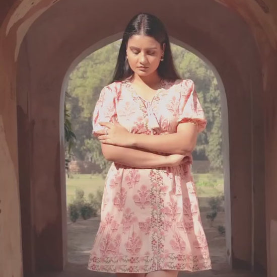 Adaahe Pure Cotton Puff Sleeve Block Print Mini Dress